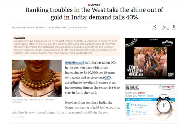 Banking troubles in the West take the shine out of gold in India; demand falls 40%