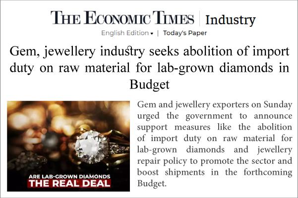 Gem, jewellery industry seeks abolition of import duty on raw material for lab-grown diamonds in Budget.
