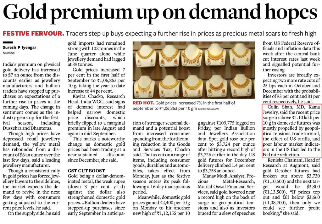 Gold prices surge amid festive demand; Colin Shah, MD of Kama Jewelry, shares insights on market trends and outlook.